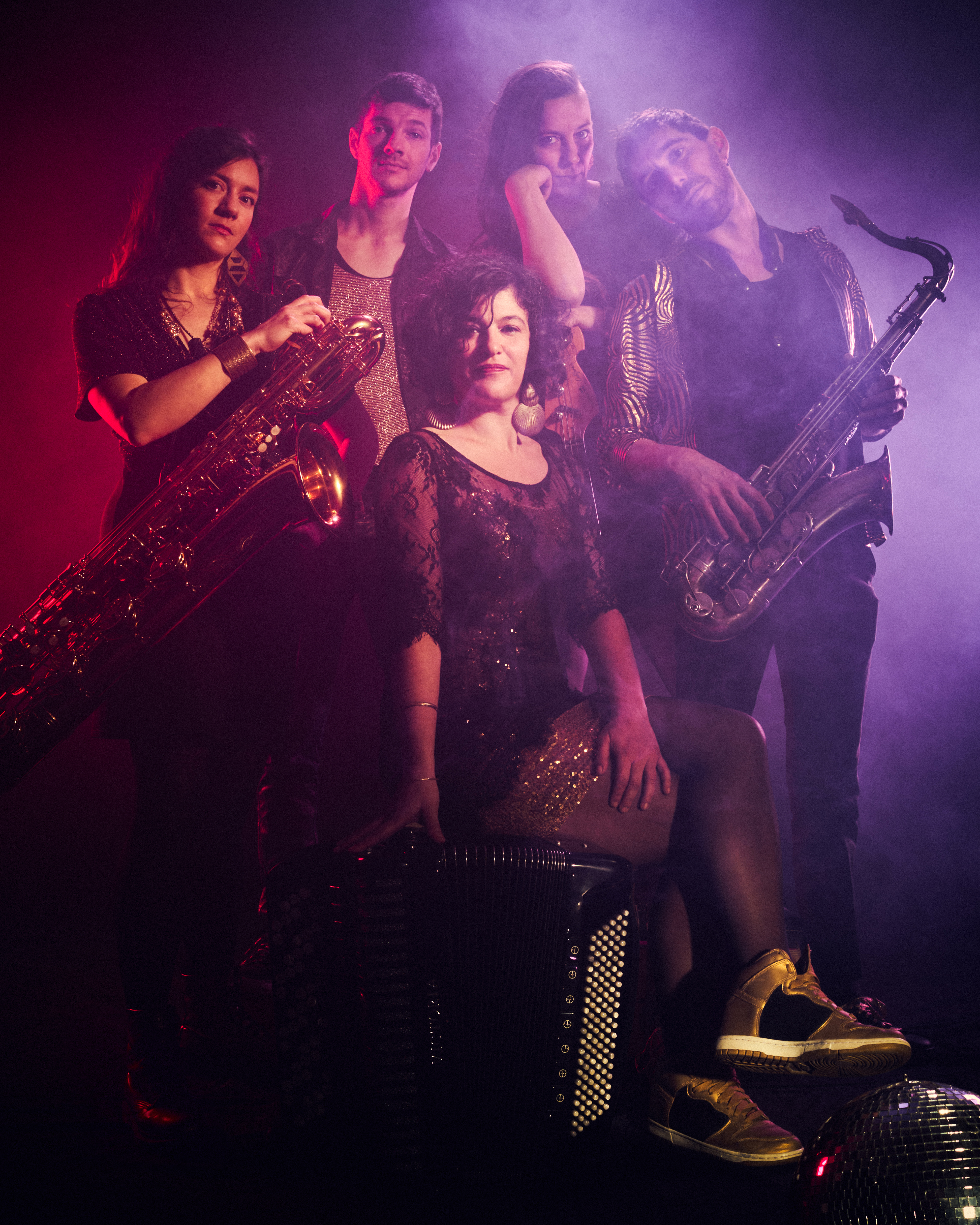 Driven by a powerful bass and drum foundation, blazing accordion lines and a versatile keyboard, saxophone and clarinet burst into electrifying dialogues. Vocals shift between striking and hypnotic, guiding listeners through a psychedelic, multilingual journey across Eastern Europe — sometimes calling for celebration, sometimes casting a spell.